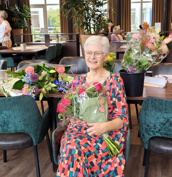 Deze ongelooflijke mijlpaal hebben haar collega’s niet ongemerkt voorbij laten gaan. Op 18 augustus was er voor Nanny een feestelijk koffiemoment om haar te feliciteren en in de bloemetjes te zetten.