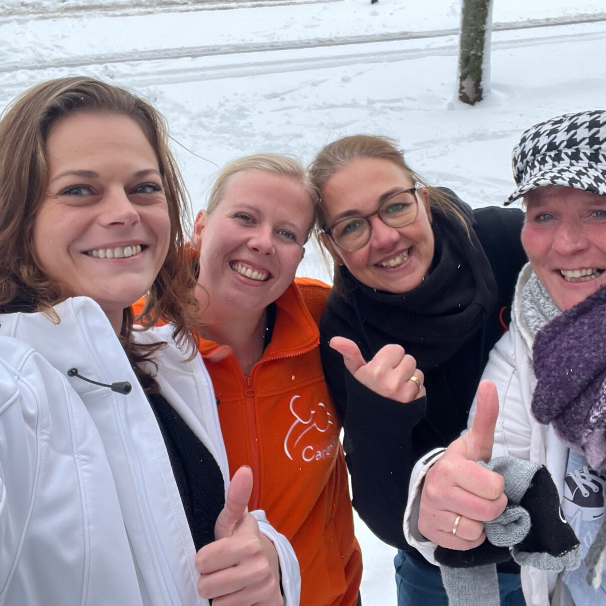 Foto: Wijkteam Akkervogels en LZO team De Wilg (Spijkenisse, ZHE) gaan door weer en sneeuw voor de cliënten. Of zoals Diaan (r.) zegt: “Blij dat ik glij, haha”.