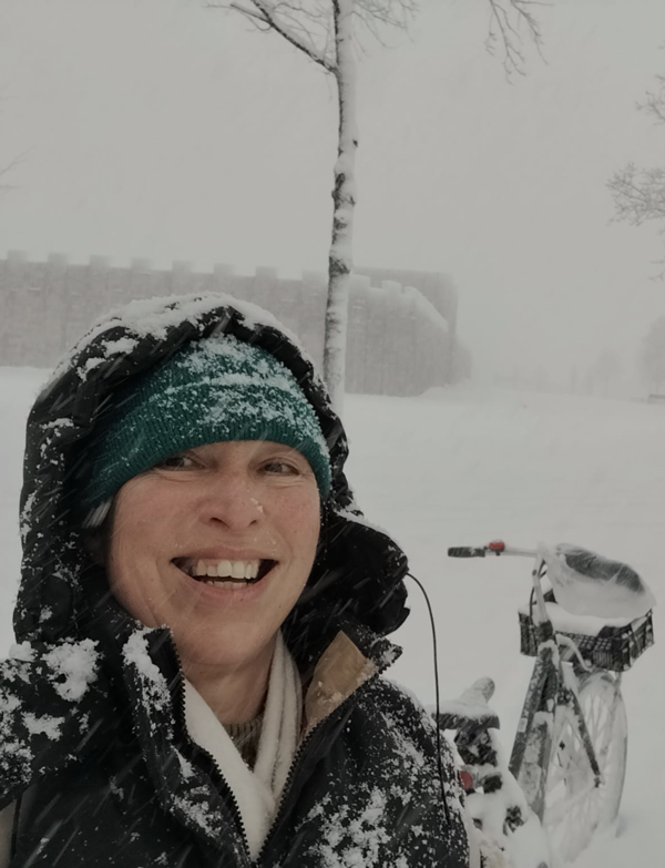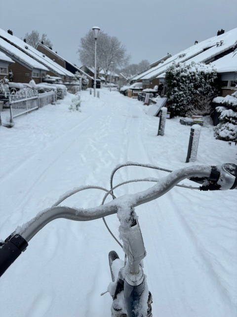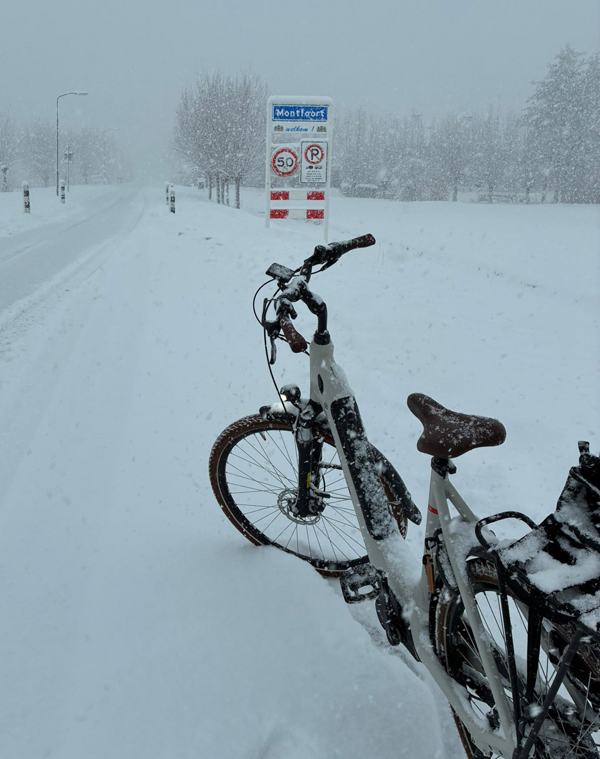 UW – maandag 5 januari, team Linschoten op de fiets over een verse laag sneeuw op weg naar cliënten.