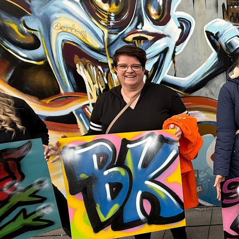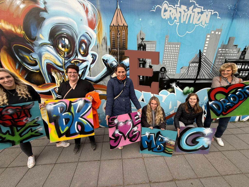 Op 17 oktober had Zorgbemiddeling Utrecht Stad haar teamuitje. We hebben een Graffiti workshop gedaan en mooie panelen gemaakt als aankleding voor ons kantoor in Tamarinde. Ook hebben we nog even reclame gemaakt voor Careyn onder het viaduct bij de Ikea in Utrecht. Zie de foto.